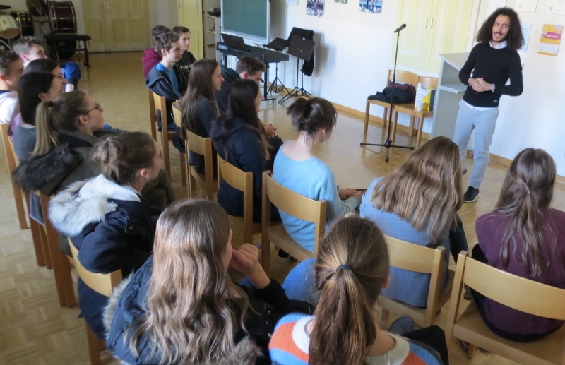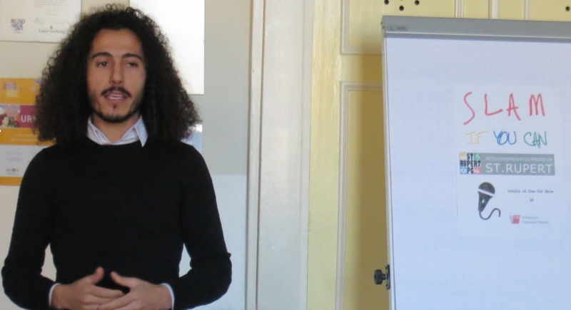 Omar Khir Alanam, ein heute in Graz lebender Poetry-Slammer und Buchautor, 2014 von Damaskus nach Österreich geflüchtet, zu Gast im Privatgymnasium St. Rupert.