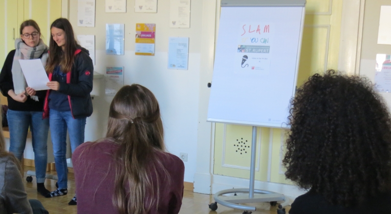 Im Anschluss richteten die Schülerinnen und Schüler, die von dem Autor und seiner positiven Lebenseinstellung sowie seiner offenen Art beeindruckt waren, zahlreiche Fragen an ihn. Zwei Schülerinnen nützen die Chance, einen selbst geschriebenen, zum Nachdenken anregenden Poetry-Slam-Beitrag vorzutragen.