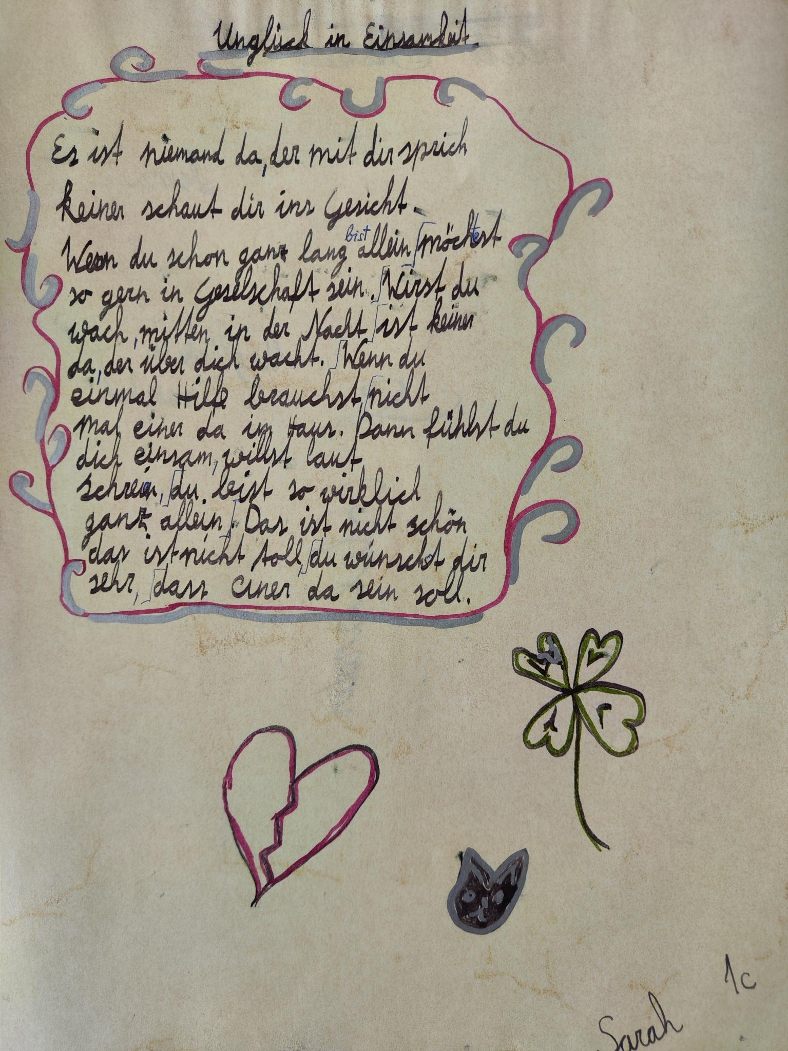 Im Rahmen der Klassenlektüre „Der Sprachabschneider“ von Hans Joachim Schädlich setzten sich die Schülerinnen und Schüler der 1C (Sprachenzweig) mit Sprache und deren Wirkung auseinander. Ausgehend von Wilhelm Buschs Gedicht „Glück der Einsamkeit“ verfassten sie eigene lyrische Texte unter dem Titel „Unglück der Einsamkeit“. Dabei entstanden eindrucksvolle Gedichte, in denen persönliche Gedanken, Gefühle und kreative Sprachbilder zum Ausdruck kommen.